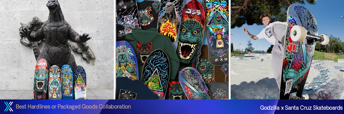 Em comemoração ao 70º aniversário de Godzilla, a Santa Cruz, ícone da cultura do skate da Califórnia, foi GRANDE com sua colaboração de estreia com o Rei dos Monstros. Alinhando-se à filosofia central da marca Godzilla, a Santa Cruz lançou seu maior skate deck de todos os tempos, o Godzilla, com dimensões monstruosas, de 11 x 32 polegadas, completo com textura inspirada em escamas. Além dos skates, a coleção Santa Cruz x Godzilla também ofereceu aos fãs de múltiplas encarnações de Godzilla uma série de roupas e acessórios. Para esta colaboração, a Santa Cruz convocou alguns de seus artistas favoritos para reimaginar os gráficos clássicos de Corey O’Brien, Tom Knox, Rob Roskopp e Natas Kaupas, com base na arte original de Jim Phillips. Os designs abrangem vários filmes de Godzilla e incluem monstros como Shin Godzilla, Mechagodzilla, Hedorah, Minilla, Mohra, Baby Godzilla, SpaceGodzilla, King Ghidorah, Ebirah, King Caesar, Jet Jaguar, Gigan, Kamacuras e Megalon.