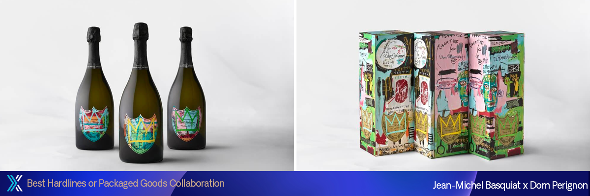 Para a homenagem da Dom Pérignon a Basquiat com sua edição especial Vintage 2015, eles escolheram uma obra do artista que é tão significativa quanto enigmática, “Em Italiano” (1983). A ressonância entre Dom Pérignon e o universo de Jean-Michel Basquiat é simbolizada por um tête-à-tête gráfico e conceitual que sobrepõe o escudo, emblema da Maison, e a coroa de três braços — uma declaração e um ícone característico do artista. Essa arte da montagem se reflete na edição especial, com três coffrets exclusivos, cada um exibindo partes da obra-prima de Basquiat como uma homenagem a esse processo criativo. O programa incluiu ampla distribuição mundial e festas de lançamento em todo o mundo, incluindo uma ativação repleta de estrelas na Fundação Brant em Nova York, com uma exibição da pintura “Em Italiano” de Basquiat.