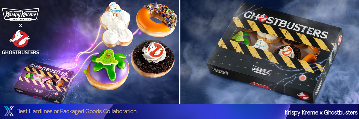 Em comemoração ao 40º aniversário do filme original dos Caça-Fantasmas e ao Halloween, a Krispy Kreme e a Sony Pictures Consumer Products lançaram uma seleção arrepiante de donuts em uma caixa especial personalizada dos Caça-Fantasmas. O programa foi exibido nas lojas de todo o país de 7 de outubro até o Halloween. Os fãs da Krispy Kreme e dos Caça-Fantasmas aproveitaram uma variedade Krispy Kreme x Caça-Fantasmas em edição limitada, com o donut Ghostbusters Cookies N’ Creme feito com OREO, o donut Slimer, o donut Ecto-Sprinkled e o donut Stay Puft Marshmallow Man Pull-Apart. Junto com os donuts Krispy Kreme x Caça-Fantasmas, havia uma nova bebida gelada, o Slimer’s Slime-ade Chiller, na cor verde ectoplasma exclusiva. A Krispy Kreme executou uma campanha de marketing integrada em apoio à colaboração, incluindo publicidade, autógrafos em lojas e conteúdo pago e orgânico em redes sociais.