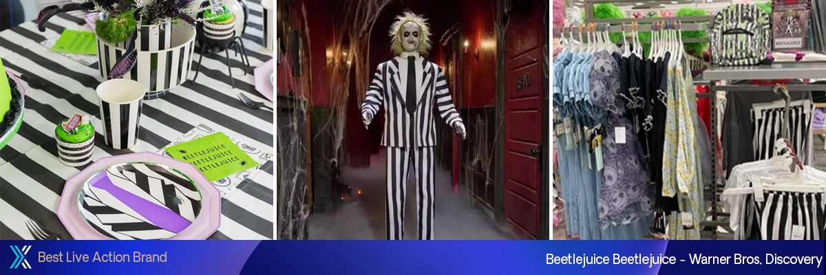 É hora do show! Para celebrar o tão aguardado Beetlejuice, a Warner Bros. Discovery Global Consumer Products lançou uma coleção de after-lifestyle com colaborações de alta costura e produtos assustadores. A coleção da Target, inspirada no estilo Northanger Prep de Astrid, incluiu um blazer com crista, uma saia-saia plissada e moletons assustadores. A Forever 21 lançou uma coleção de 40 peças, enquanto a Dolls Kill entregou moda ousada e assustadora. Taylor Joelle e Bums & Roses ofereceram roupas infantis estilosas, e os óculos de sol ousados da Diff Eyewear fizeram uma alusão ao sobrenatural. Os acessórios da Loungefly, os sapatos fluorescentes da HEYDUDE e as unhas postiças assustadoras da Glamnetic adicionaram um toque assustador. O Halloween foi um sucesso com as fantasias da Party City, Rubies e Spirit, além dos infláveis da Gemmy. Os biscoitos de chocolate amargo da Keebler imitavam o traje de Beetlejuice, enquanto as réplicas e bonecos da NECA cativaram os fãs com mais de um milhão de impressões nas redes sociais. Beetlejuice se consolidou como uma franquia perene.