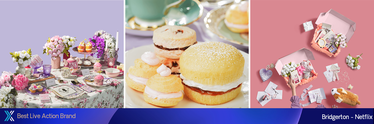 A Netflix e a Shondaland lançaram parcerias de estilo de vida para permitir que os fãs “Viva como um Bridgerton” desde dezembro de 2023. Essas colaborações permitem que os fãs se entreguem ao romance de Bridgerton diariamente, oferecendo produtos como pijamas de seda, itens essenciais para o banho com aroma de rosas e muito mais. Com mais de 35 parceiros, as coleções abrangem beleza, moda, gastronomia, fragrâncias, decoração para casa e muito mais, com o objetivo de transportar os fãs para um mundo moderno da Regência. A iniciativa incluiu ativações de fãs, acrobacias e pop-ups em vários países ao longo de oito meses, colaborações com membros do elenco e uma série de conteúdo digital que gerou mais de 87.000 cliques no varejo. A campanha destacou a terceira temporada, com várias coleções superando as projeções de vendas. Notavelmente, a Lush teve um aumento de 25% no número de assinantes e a postagem da coleção da Primark ganhou 21,3 milhões de visualizações no TikTok. A iniciativa recebeu aclamação da indústria, incluindo um Grand Clio Award em 2024.
