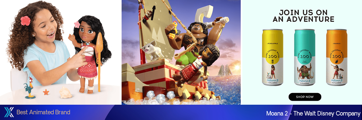 Apoiando o lançamento nos cinemas de Moana 2 , a Disney lançou um robusto programa global de produtos, transformando a estratégia de produtos de séries em um suporte cinematográfico de grande sucesso em apenas 11 meses. O programa multicategoria foi construído com base na adorada franquia Moana e Moana 2 sustentou o impulso, atingindo US$ 1 bilhão nas bilheterias. O produto foi lançado em categorias-chave em 370 parceiros, incluindo brinquedos de linha dura da Mattel, Jakks, LEGO, Funko e American Girl; vestuário de linha leve da Centric e Cakeworthy; casa da Posh Peanut; e novos parceiros de consumíveis Better Sour e 100 Coconuts. O programa conquistou posicionamento de destaque em varejistas globalmente e exibiu uma campanha de marketing multiempresarial, apresentando um sorteio exclusivo de mais de um milhão de cards Lorcana em mais de 460 cinemas, aquisições em shoppings, conteúdo para download do Minecraft e forte suporte social, incluindo uma recriação de trailer LEGO.