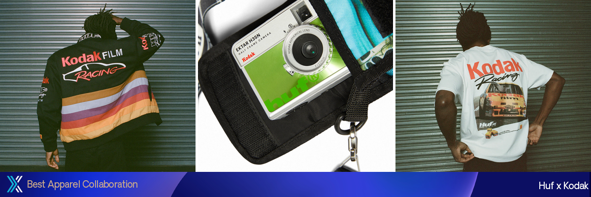 A HUF x Kodak celebrou a arte atemporal da fotografia 35mm combinando os gráficos retrô da Kodak com a estética icônica de skate wear da HUF, conectando a Kodak com a Geração Z e a comunidade do skate onde a HUF tem raízes profundas. A coleção apresentou itens de destaque como a câmera half-frame Kodak Ektar H35 N de edição limitada, acessórios e vestuário. Para lançar a coleção, a HUF criou um curta-metragem com Tyler Smolinski, misturando filmagens de skate de arquivo com novos clipes da equipe de skate da HUF. Disponível globalmente online, a coleção esgotou rapidamente — câmeras, pingentes, chapéus e muito mais foram adquiridos nas mais de 30 lojas independentes da HUF no Japão, bem como em lojas de skate e butiques selecionadas em todo o mundo. A HUF x Kodak levou a tendência analógica a um público novo e mais amplo.