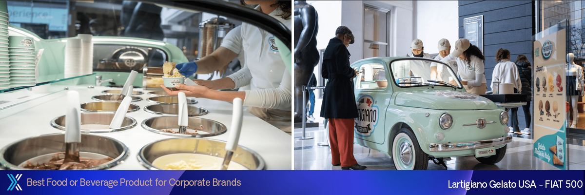 O FIAT 500 x L’Artigiano Gelato é uma colaboração que alavanca a renomada reputação italiana do gelato. Dois ícones italianos estão prontos com o L’Artigiano Gelato com o objetivo de se tornar a marca de gelato mais vendida a bordo do lendário FIAT 500. É a fusão perfeita entre o ícone italiano da mobilidade — o vintage Fiat 500 — e uma de suas excelências culinárias — o gelato. Os dispensadores sendo carros FIAT 500 antigos evocam um estilo de vida de lazer retrô “Dolce Vital” relevante para ocasiões de consumo de sorvete. 2024 marcou o 125º aniversário da FIAT e a inauguração da primeira loja pop-up da Gelato (o carrinho “Gelateria”), um ponto de venda de sorvetes no formato de um Fiat 500 de 1958. Em 2024, as três primeiras Gelaterias Fiat 500 foram abertas em Nova York.